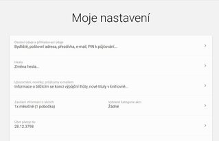 Z úvodní stránky “Můj účet”, po kliknutí na tlačítko “NASTAVENÍ” se dostanete do položky Moje nastavení, kde můžete spravovat: