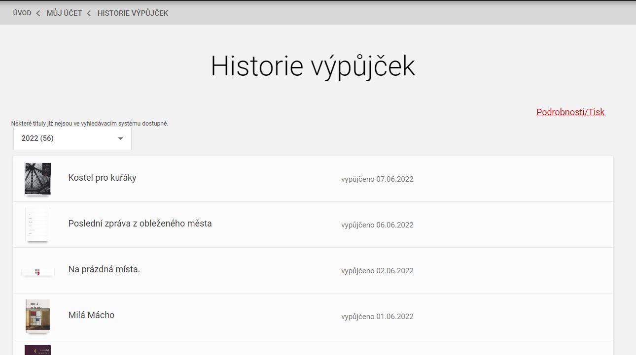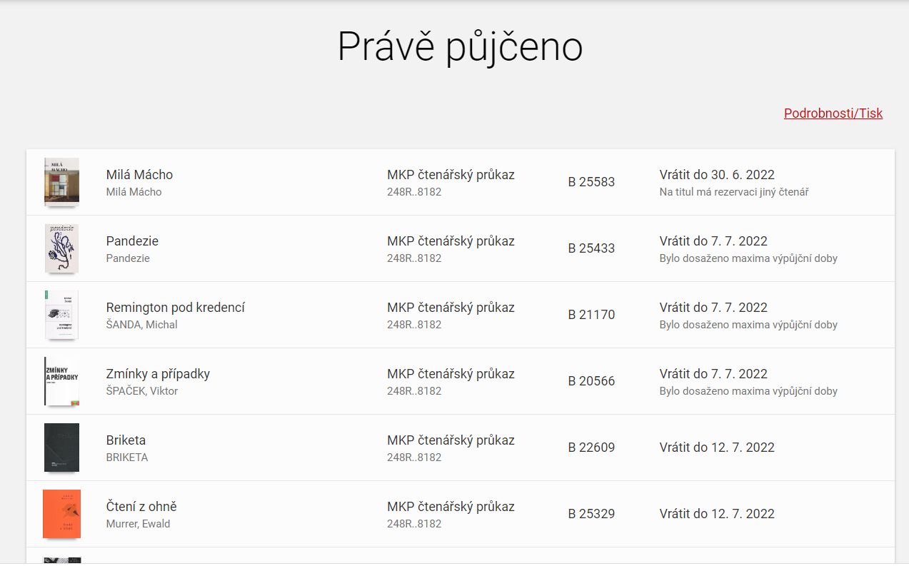 Na dlaždici „Výpůjčky“ se zobrazuje číslo informující o počtu půjčených knih a dalších dokumentů. Po rozkliknutí „Výpůjček“ se dostanete na stránku „Právě půjčeno“, kde najdete seznam všech půjčených knih i s datem, do kdy je můžete mít doma. Zároveň po kliknutí dojde k prodloužení těch výpůjček, u kterých je to možné. Seznam půjčených knih si můžete také vytisknout kliknutím na nápis „Podrobnosti/Tisk“ vpravo nahoře.