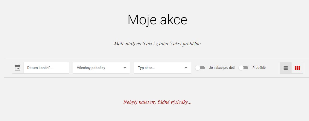 “Akce” vám umožní vytvořit seznam kulturních akcí, které vás zaujaly v programu našich poboček nebo v sálech Ústřední knihovny. Počet uložených akcí je opět označen viditelným číslem.