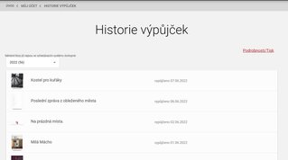 Na kartě “Historie výpůjček” naleznete všechny své dříve půjčené knihy. Historii výpůjček si můžete vytisknout stejným způsobem, jako tomu je u seznamu „Právě půjčeno“. Historii výpůjček si můžete exportovat do formátu CSV a můžete ji i celou vymazat. Pozor! Načítání historie výpůjček může trvat delší dobu.