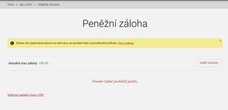 Pod dlaždicí “Záloha na placení” najdete informace o aktuálním stavu vaší peněžní zálohy a také přehled uhrazených transakcí (lze stáhnout do PDF). Peněžní zálohu si můžete navýšit kliknutím na tlačítko “DOBÍT ZÁLOHU” a dále zvolit, zda chcete operaci provést online platební kartou, nebo bankovním převodem (zálohu je také možné zaplatit v některé z našich poboček). Přečtěte si návod, jak platit bezhotovostně.