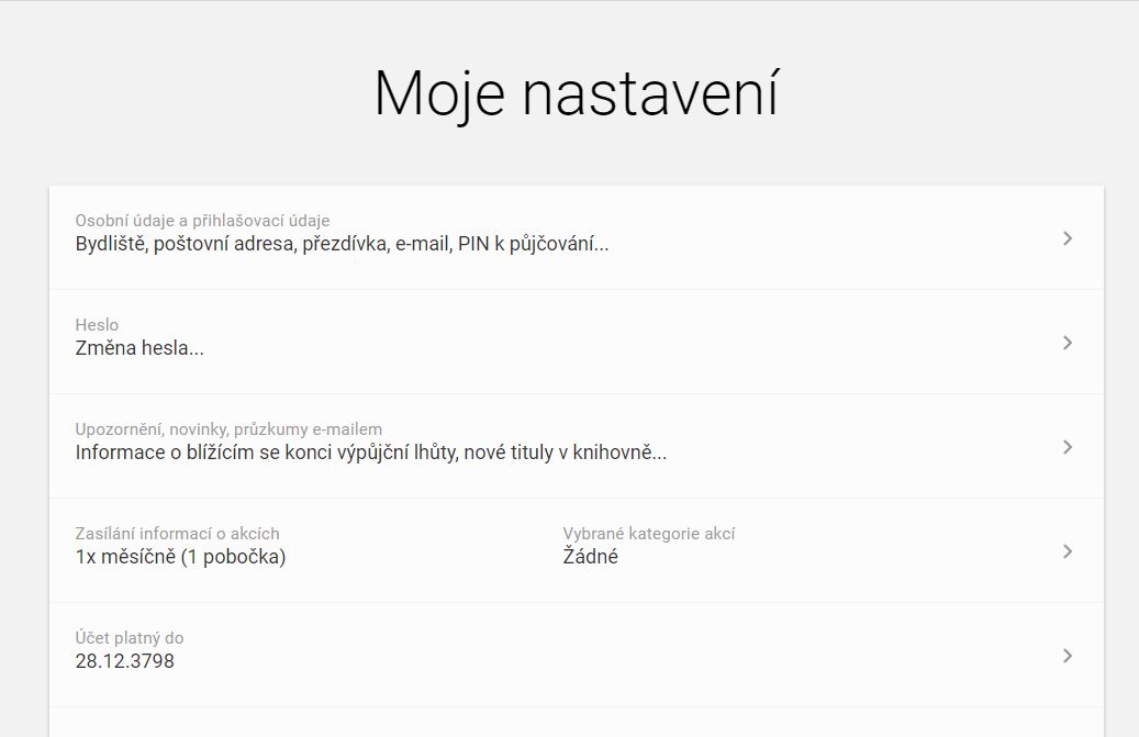 - osobní údaje a přihlašovací údaje (bydliště, poštovní adresa, přezdívka, PIN k půjčování, e-mail u čtenářů nad 15 let),